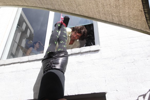 1st assistant director Joyce Ng with dummy dressed by costume designer Gali Shohat